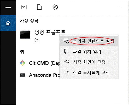- “명령 프롬프트”를 마우스 오른쪽 버튼으로 클릭하고 “관리자 권한으로 실행”을 선택합니다.