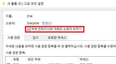 - 이제 “고급 보안 설정” 창으로 돌아갑니다. “하위 컨테이너와 개체의 소유자 교체” 옵션을 선택합니다. “적용” 버튼을 클릭하여 계속합니다.