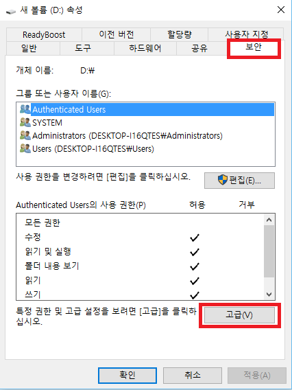 - “보안” 탭을 클릭한 다음 “고급”을 클릭합니다.