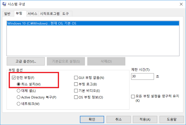 - “부팅” 탭을 열고 “부팅 옵션”으로 이동한 다음 “안전 부팅”을 선택하고 “적용” 버튼을 클릭한 후 시스템을 재부팅하세요. 가장 기본적인 안전 부팅 방법입니다.