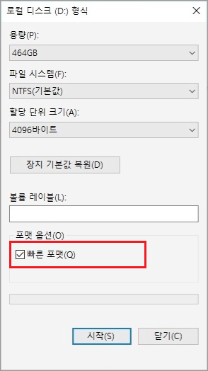 - 시스템은 포맷 용량, 파일 시스템, 디스크 레이블을 확인하라는 메시지를 표시할 것입니다. 빠른 포맷을 선택하고 “시작” 옵션을 클릭하여 드라이브를 포맷합니다.