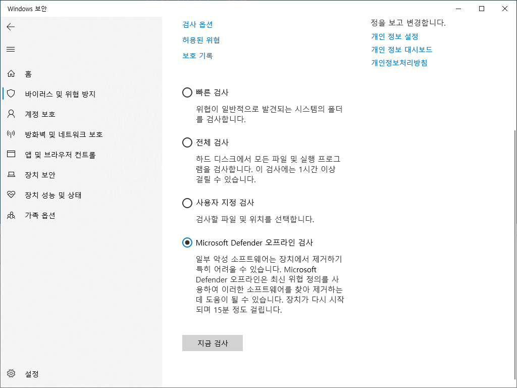 또한 완전 스캔 외에도 Microsoft Defender 오프라인 스캔을 실행할 수도 있습니다.