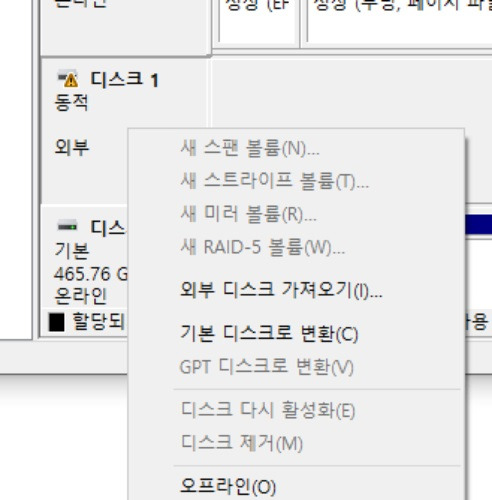 - 디스크 관리에서 기본 디스크를 마우스 오른쪽 버튼으로 클릭하고, 드롭다운 목록에서 ‘동적 디스크로 변환’ 옵션을 선택합니다. ‘확인’을 클릭하여 변환을 완료합니다.