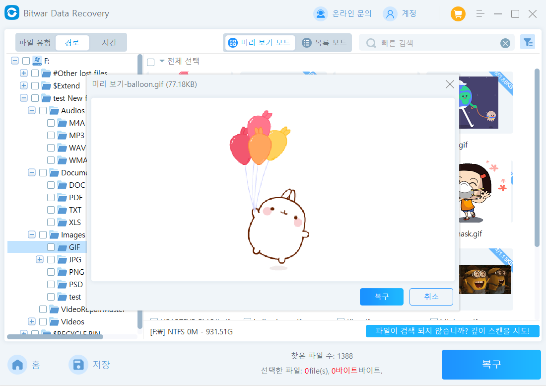 위의 방법으로 문제가 해결되지 않았다면, Bitwar Data Recovery와 같은 신뢰할 수 있는 데이터 복구 소프트웨어를 사용하는 것이 좋은 선택입니다. 이 소프트웨어는 사용자 친화적이며 다양한 기능을 제공하여 외부 하드 디스크, 메모리 카드, USB 드라이브 등에서 문서, 이미지, 오디오, 비디오 파일을 복구할 수 있습니다.