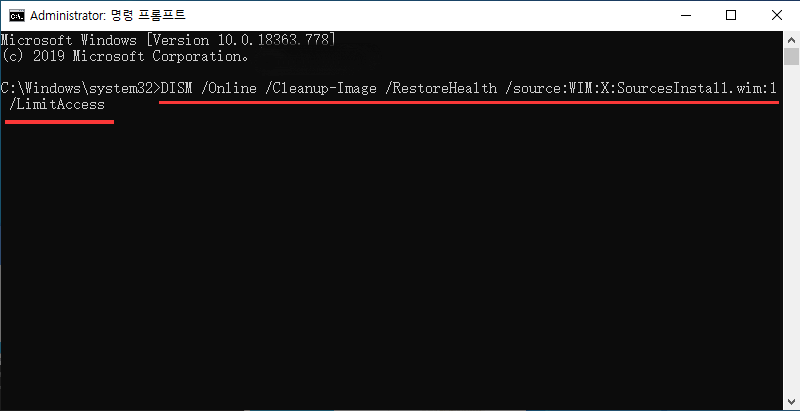 2 단계: "DISM /Online /Cleanup-Image /RestoreHealth /source:WIM:X:SourcesInstall.wim:1 /LimitAccess" 명령 프롬프트에서 Enter 키를 눌러 실행하십시오.