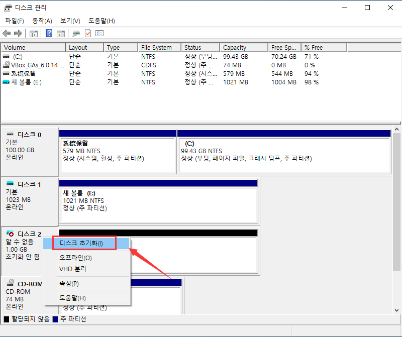 2. 하드 드라이브가 보이면 마우스 오른쪽 버튼으로 누르고 "디스크 초기화"를 누르십시오.