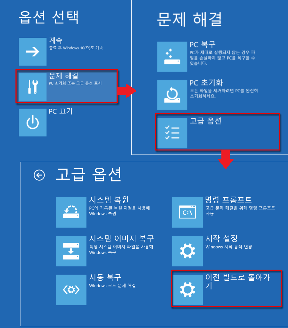 2) Win10 재부팅은 자동으로 시스템 메뉴 선택 옵션에 들어갑니다. “문제 해결” → “고급 옵션” → “이전 구성으로 되돌리기”를 클릭합니다. 그런 다음 메시지에 따라 이전 시스템으로 돌아갈 수 있습니다.